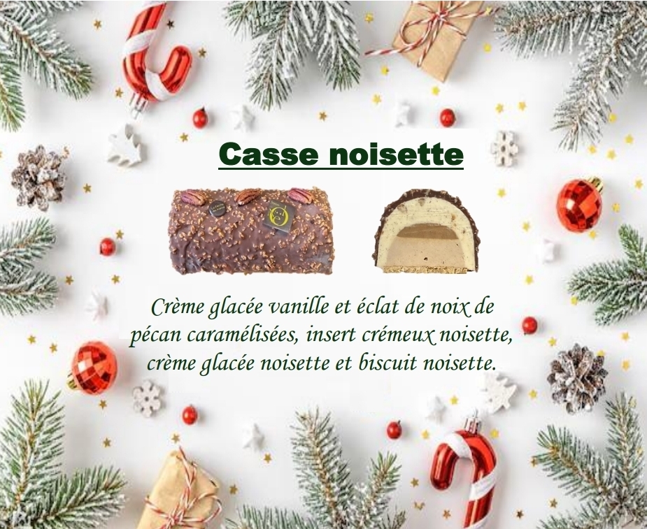 Crème glacée vanille et éclat de noix de pécan caramélisées, insert crémeux noisette, crème glacée noisette et biscuit noisette.